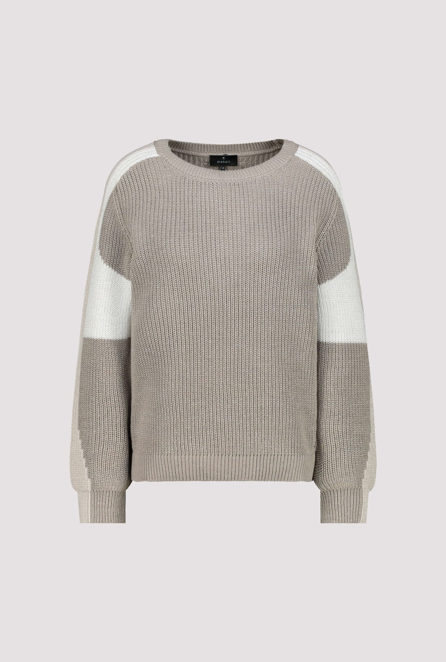 Monari's greige knitted jumper shimmers softly with lurex threads and a glittering logo patch at the back, woven from a cotton-acrylic blend that offers warmth and subtle sheen without weight. The colour blocking and round neck create a modern outline, with dropped shoulders for relaxed appeal that layers beautifully.