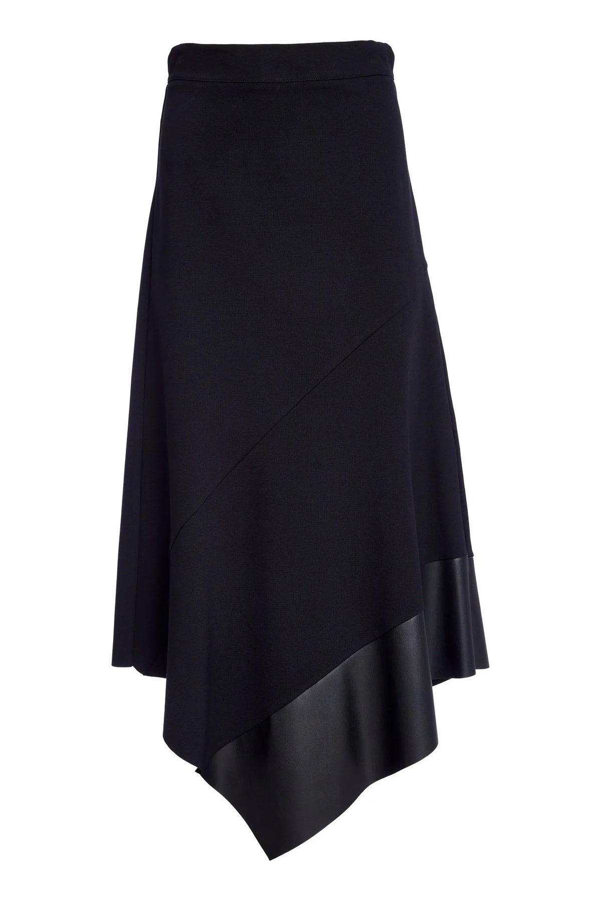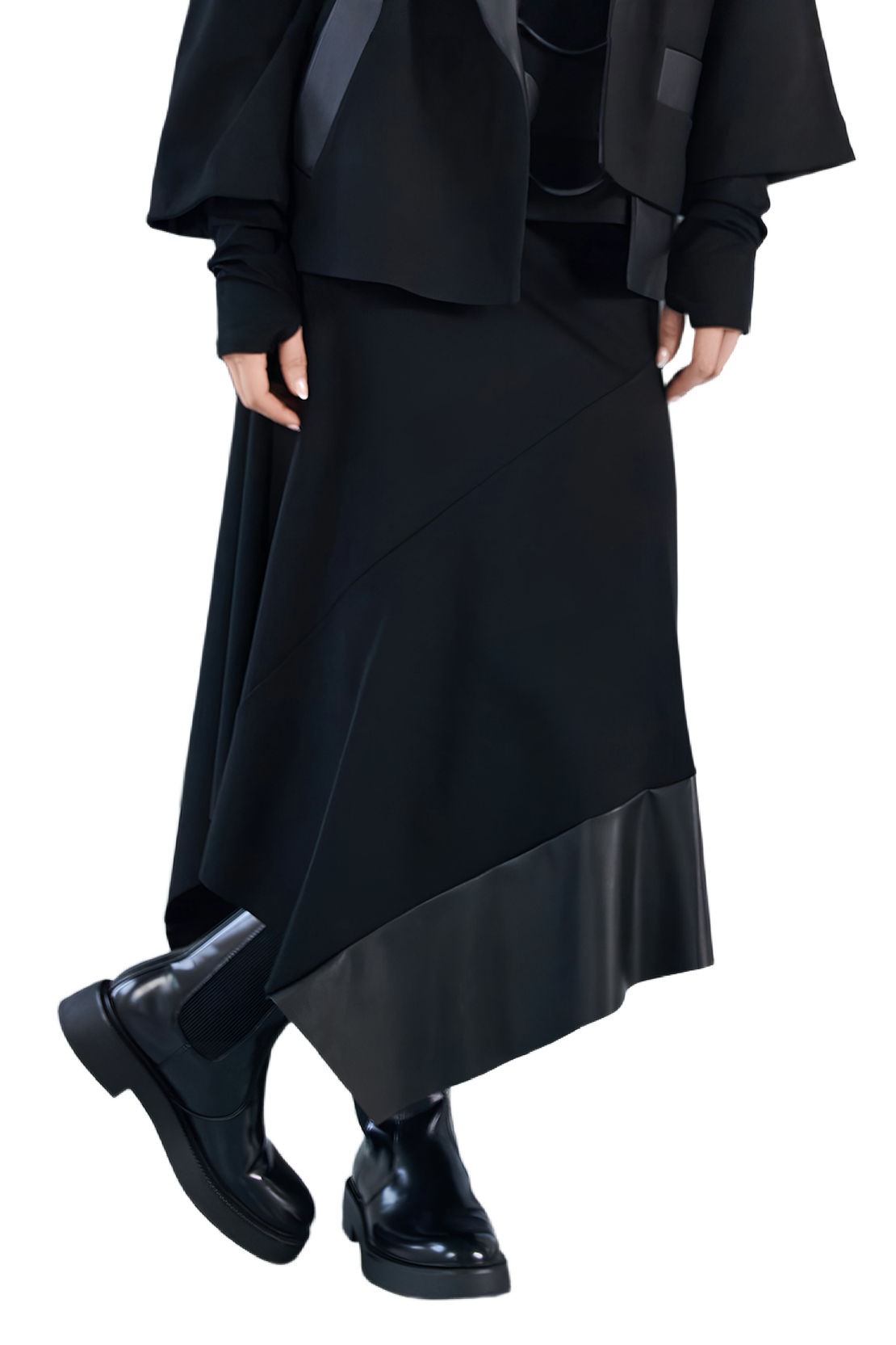 NAYA's black asymmetric hem skirt brings a sharp, modern twist to everyday dressing with its angled hem and sleek leatherette trim. Cut from a soft, stretchy viscose blend in classic black, it drapes smoothly for a flattering fit that skims the body without clinging. The pull-on waistband keeps things easy and comfortable, while the asymmetric lines add just enough interest to stand out.