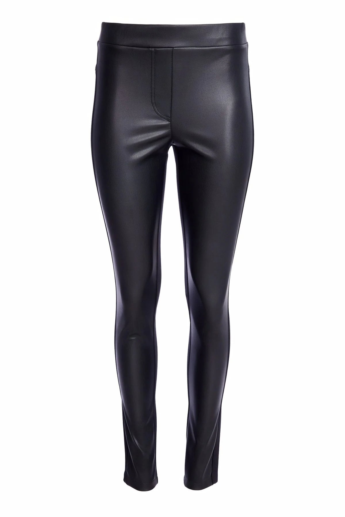 NAYA's black leatherette leggings shine with a faux front panel in stretch fabric, backed by soft jersey for breathable wear. The high waist and slim fit create a sleek base.
