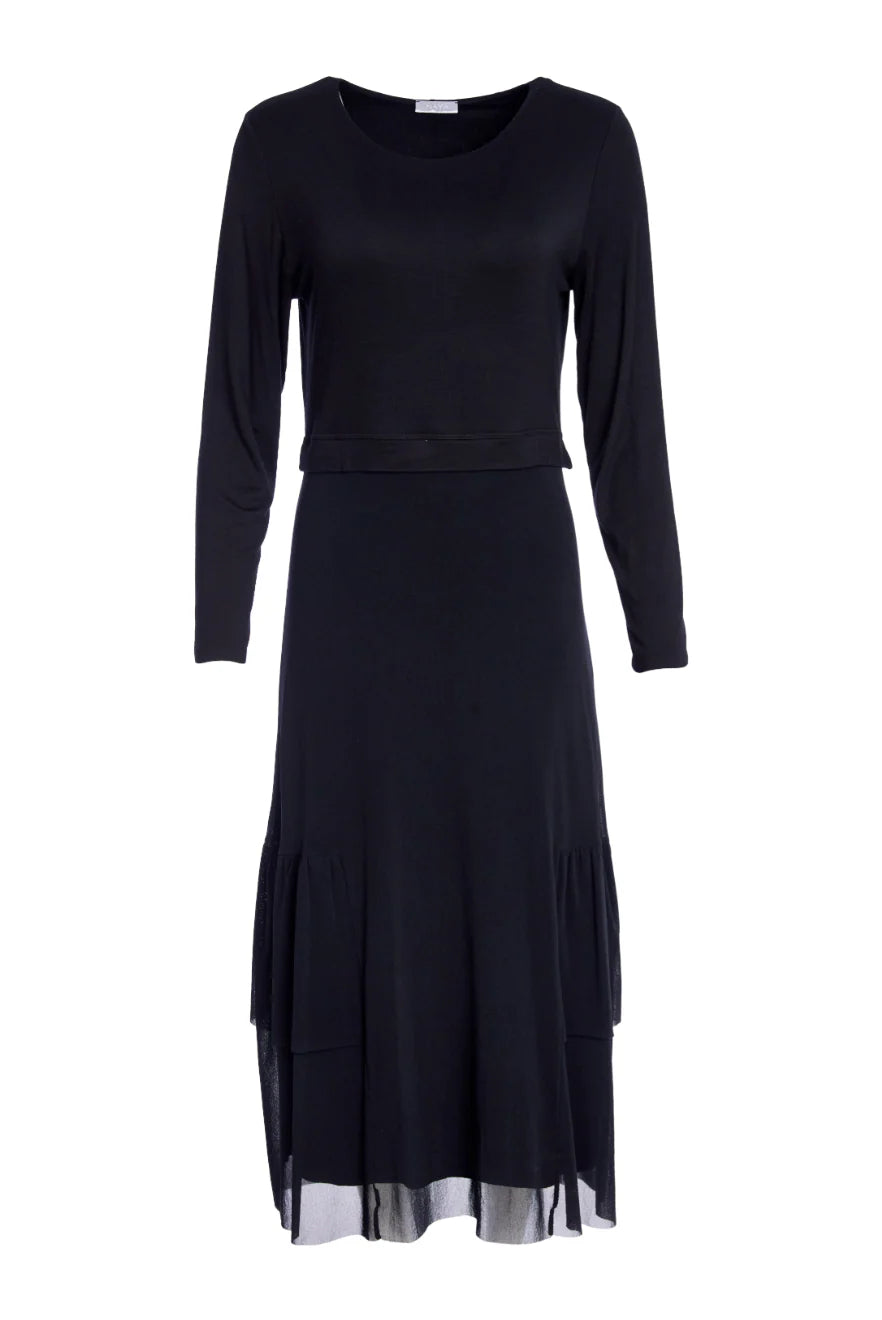 NAYA's black round-neck dress pairs a jersey bodice with a sheer mesh skirt for textural contrast, ending in a frilled hem that sways gently. The midi length and easy pull-on style suit seamless transitions.