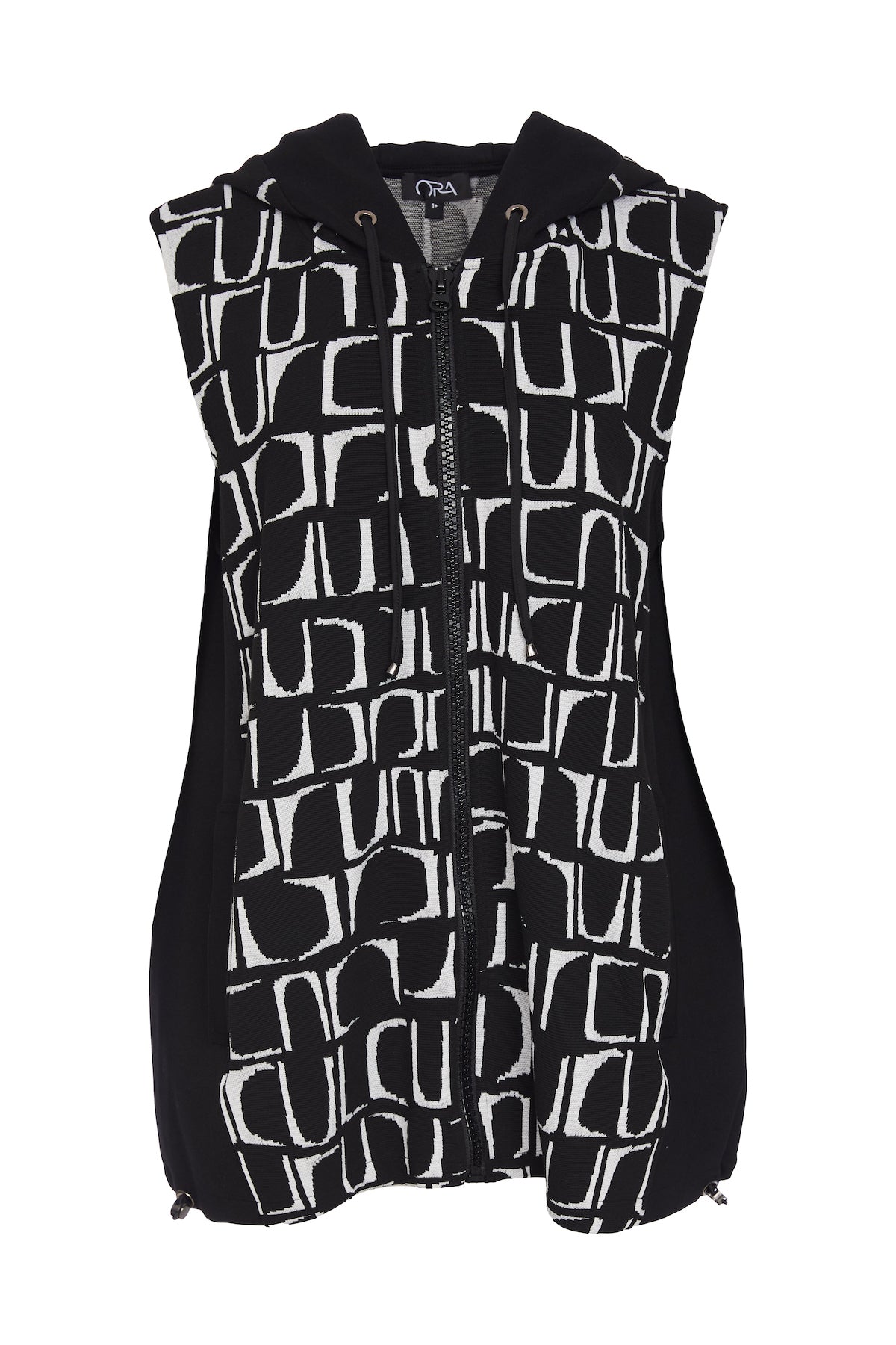 Master the art of autumn layering with ORA’s longline jacquard knit waistcoat, a bold yet refined addition to the mid to plus-size wardrobe. This piece reimagines the monochromatic trend with a striking print jacquard, blending timeless sophistication with modern edge. The sleek silhouette is enhanced by a classic hood, a chunky black zip, and deep contrast side panels that sculpt the figure, while the drawstring hem allows for a customised fit.