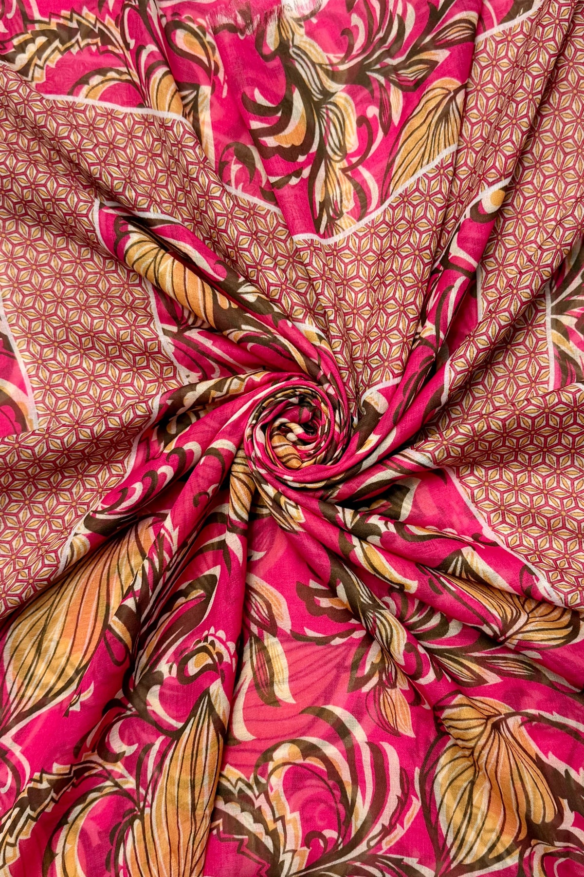 Indian inspired fuchsia pink leaf print frayed scarf. Size: 90cm x 180cm