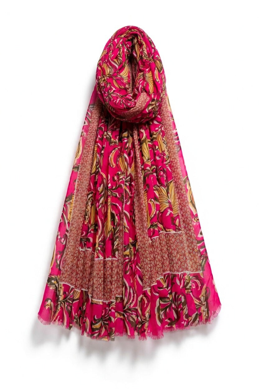 Indian inspired fuchsia pink leaf print frayed scarf. Size: 90cm x 180cm