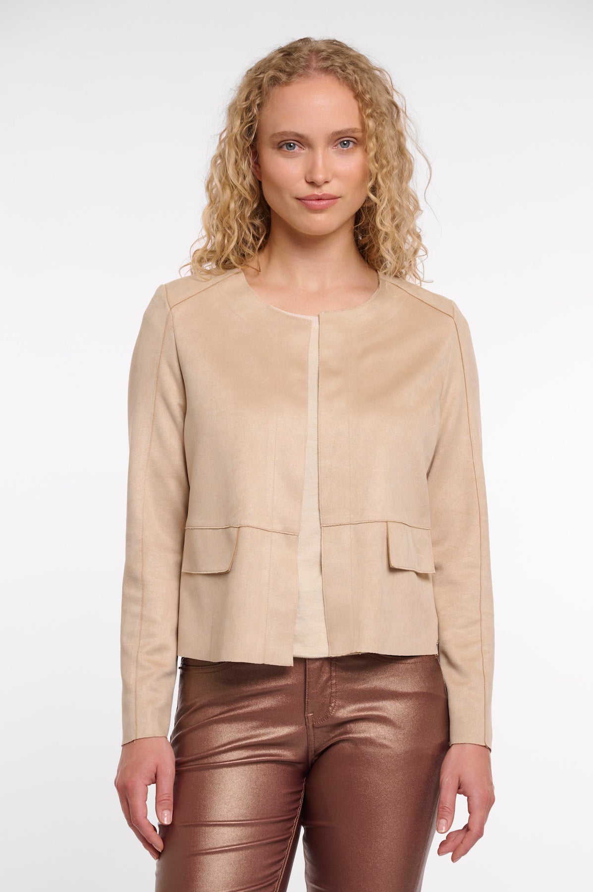 This slim-fit jacket by Rino & Pelle just screams understated elegance, crafted from soft, supple faux suede that beautifully follows the body’s shape. Designed with a clean round neckline, refined seam lines that accentuate the feminine silhouette, and decorative front pockets, it offers a polished yet effortless look.