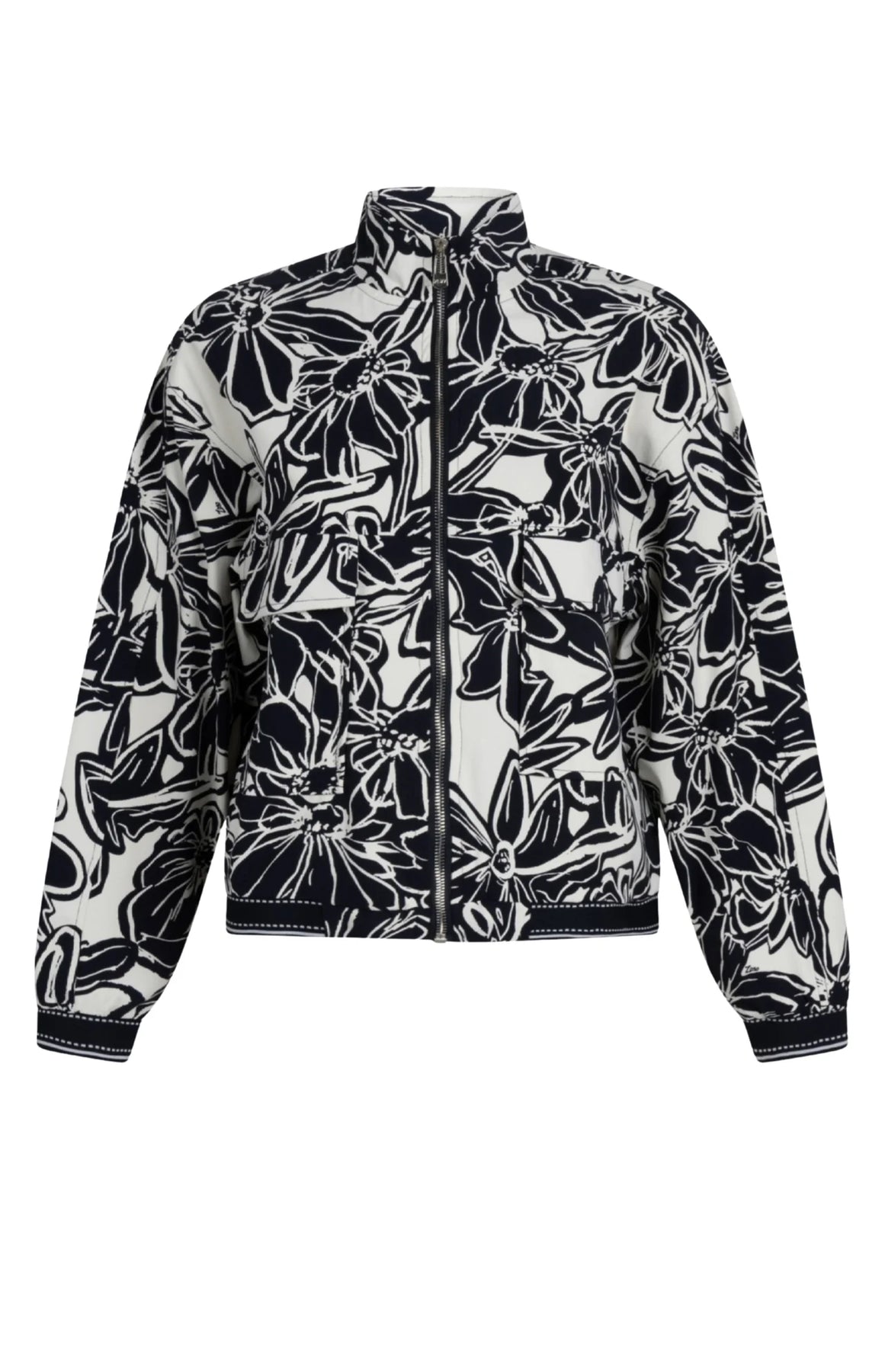 The Travel Jacket Jenny Night Blue by Zoso is a sporty bomber jacket in flexible travel fabric. Graphic floral print and zipper with ribbed cuffs give a modern, preppy look. The ecom model is 175 cm and is wearing a size M.